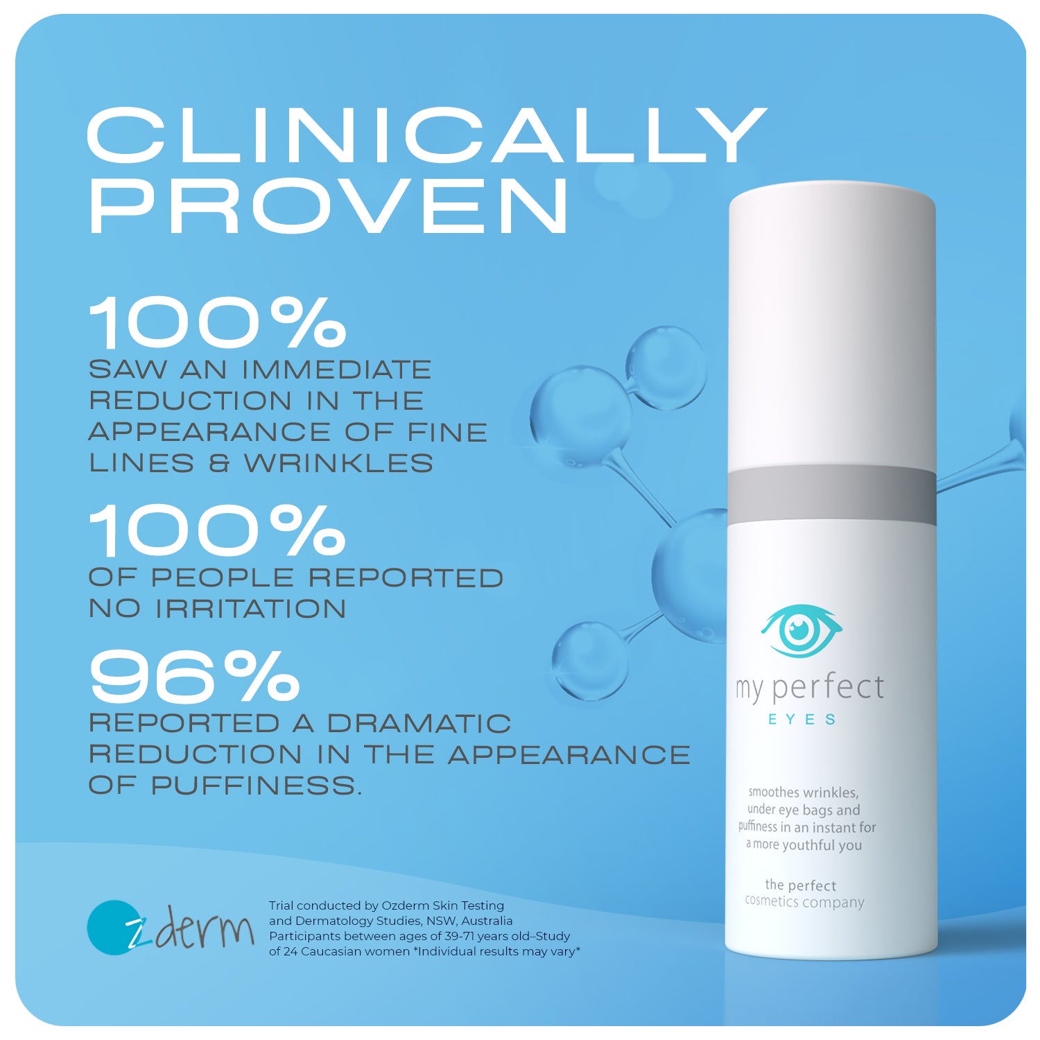 Clinical trials for My Perfect Eyes, conducted by Ozderm Skin Testing and Dermatology Studies in NSW, Australia, highlight the product's exceptional effectiveness and lasting impact. These trials make My Perfect Eyes unique in the skincare market, where few cosmetic products undergo rigorous clinical testing.